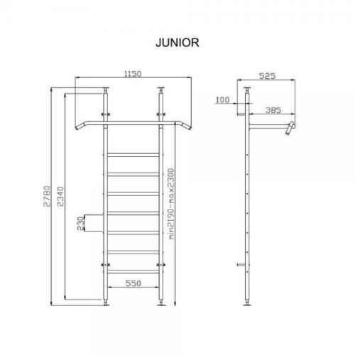 Габаритні розміри (в х ш х г, см): 227 х 66 (115 см ширина по турніку) х 56 (відстань від стіни до турніка)